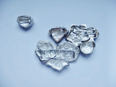 Japanese sweets made of pressed sugar, eaten during tea time, cast in silver. Several ways of arranging them as individual brooches or a brooch area.